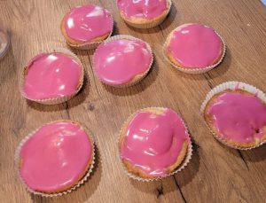 De auteur heeft roze koeken gemaakt zonder melk vanwege lactose-intolerantie, met een recept van Dr. Oetker. Na het mengen van…